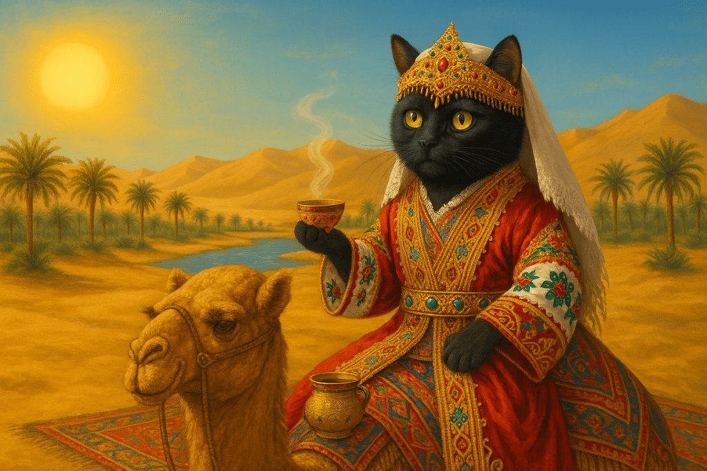 Una gatta vestita d’oro e velluto, con un sorriso enigmatico e le zampette leggere come vento sul dattero.